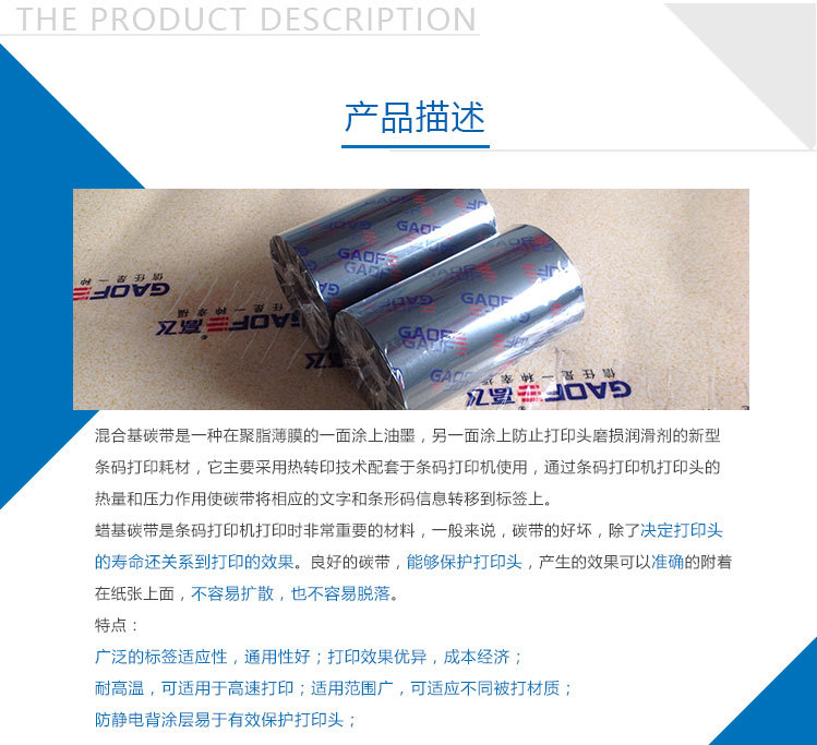 混合基碳帶品質(zhì)高、高速打印性能,優(yōu)異的耐磨擦、耐熱、耐腐蝕、耐久性能,耐磨能滿足各種苛刻環(huán)境要求,高敏感度,確保優(yōu)異的圖像打印效果,防靜電背涂層,有效保護打印頭。