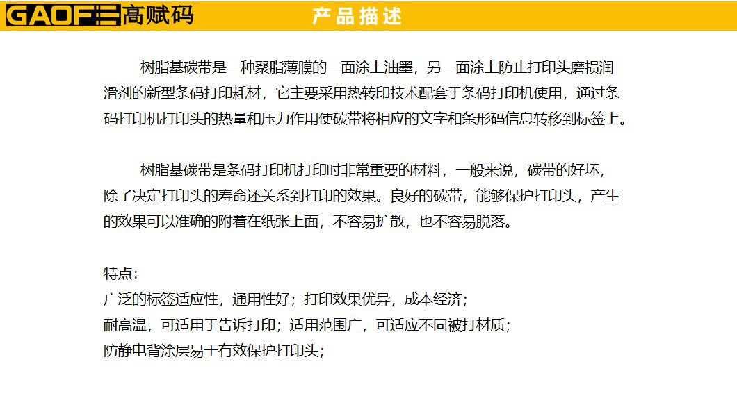 樹脂基碳帶品質(zhì)高、高速打印性能,優(yōu)異的耐磨擦、耐熱、耐腐蝕、耐久性能,耐磨能滿足各種苛刻環(huán)境要求,高敏感度,確保優(yōu)異的圖像打印效果,防靜電背涂層,有效保護打印頭。