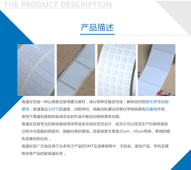 高溫標(biāo)簽聚酰亞胺薄膜為基材,涂以特種壓敏膠而成,具有較好的耐化學(xué)性和耐磨性,耐溫范圍200℃~600℃,對助焊劑、熔融劑和清潔劑等化學(xué)物質(zhì)具有抗腐蝕作用,使用于高溫和磨損的極端惡劣的環(huán)境中能保持原本性能。它是專為印刷電路板用字符或條形碼標(biāo)簽而設(shè)計,因為它可以經(jīng)受生產(chǎn)印刷電路板過程中所面臨的焊接劑、熔融劑等的侵蝕。目前厚度主要是25um、50um兩種。常用的顏色是黑色和白色 。高溫標(biāo)簽廣泛地應(yīng)用于眾多電子產(chǎn)品的SMT及波峰制程中、主機板、腐蝕產(chǎn)品、手機及鋰電池等產(chǎn)品的PCB板高溫標(biāo)簽。